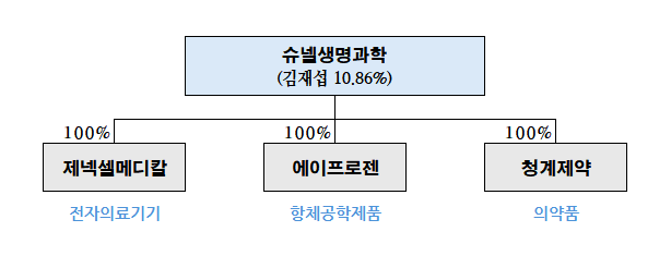 김재섭 회장의 지분율은 10.86%로 낮았지만 특수관계인인 에이프로젠의 지분과 팝인베스트먼트에서 양도받은 신주인수권을 합하면 48.43%에 달했습니다. 확실한 지배력을 보유하고 있었다고 할 수 있죠. 김재섭 회장은 슈넬생명과학의 최대주주이자 대표이사를 겸하고 있었고, 에이프로젠의 바이어시밀러 연구진을 이끌고 있었습니다.