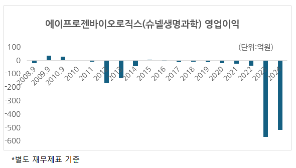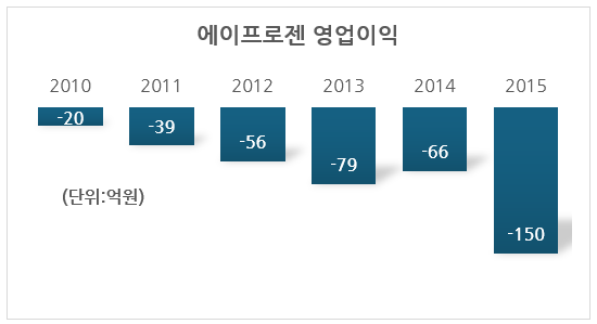 영업현금흐름이 적자를 지속하고 있던 슈넬생명과학에게 에이프로젠 지원은 큰 부담이었을 것입니다. 그래서인지 슈넬생명과학은 간신히 이어오고 있던 영업이익 흑자가 깨지고 2011년 이후 에이프로젠바이오로직스로 이름을 바꾼 지금까지 단 한 번도 영업흑자로 한 해를 마감한 적이 없습니다.