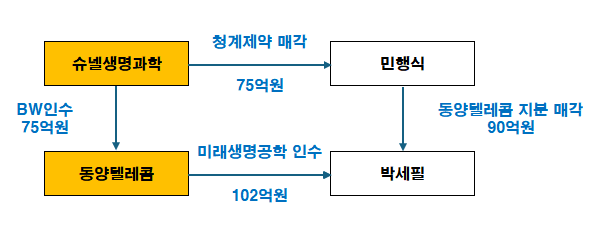 동양텔레콤은 바이오줄기세포사업으로 다각화할 목적으로 사채를 발행한 것이었고, 발행자금은 미래생명공학연구소㈜라는 회사의 지분매입(102억원)에 쓰였습니다. 또 미래생명공학연구소 박세필 대표이사는 민행식 부행장이 보유하던 동양텔레콤 주식 600만주를 90억원에 사들입니다. 모두 같은 날 이루어진 거래입니다.