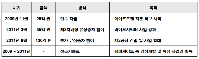 슈넬생명과학이 에이프로젠이 개발하는 신약에 대해 독점 판매권을 갖는 기술도입계약도 이루어졌습니다. 레미케이드, 리툭산, 허셉틴의 국내 임상개발 및 사업화 권리 일체를 슈넬생명과학이 갖는 대신 선급기술료가 제공되었죠. 에이프로젠의 신약 개발과 관련된 임상시험비용을 슈넬생명과학이 부담하게 된 셈입니다.