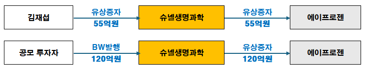 당시 에이프로젠은 사실상 이렇다할 매출을 창출하지 못하고 있었고 연간 적자가 20억원에 달했습니다. 그런데도 액면가 500원짜리 신주를 주당 2200원에 사줍니다. 김재섭 회장이 슈넬생명과학을 거쳐 에이프로젠에 출자하는 구조였지만, 에이프로젠 출자에 따른 위험은 상장사 슈넬생명과학의 몫이었죠.