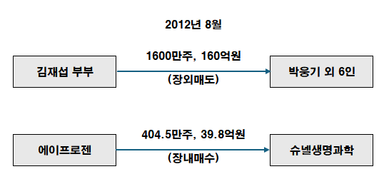슈넬생명과학의 최대주주는 결국 바뀝니다. 그런데 김재섭 회장의 지분 매각 때문이 아닙니다. 김재섭 회장이 실질적인 소유자인 에이프로젠이 주당 500원에 1000만주를 제3자배정 유상증자로 출자하면서 2013년 10월 최대주주에 올라섭니다. 바이오시밀러 연구개발에 쓰여야 할 에이프로젠의 자금이 슈넬생명과학 지분 취득에 사용됐다고 볼 수도 있습니다.