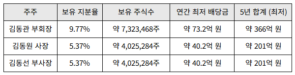 하지만 한화에너지 지분 매각으로 이미 증여세 납입 재원은 마련됐다고 볼 수 있습니다. 게다가 앞으로 ㈜한화로부터 받게 될 배당금도 늘어날 것으로 보이죠? 한화가 배당금을 최소 주당 1,000원 이상 지급한다고 하니 향후 5년 동안 받을 배당금 총액이 최소 약 201억원에 달합니다. 한화에너지가 보유한 ㈜한화 지분(22.16%)에서 발생하는 연간 약 166억원의 배당금도 삼형제의 배당 재원으로 활용될 수 있습니다.