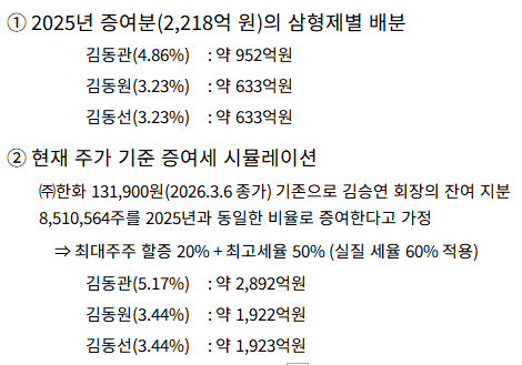 증여세는 김동선 부사장에게 큰 부담입니다. 2025년 3월 당시 증여분에 대한 삼형제의 세 부담은 2,218억원이라고 합니다. 지분비율대로 안분하면 김동선 부사장 몫은 약 633억원입니다. 김승연 회장의 ㈜한화 잔여 지분을 2025년 3월 당시와 동일한 비율로 증여한다고 가정하면 현재 주가(131,900원, 3월 6일) 기준으로 약 1,922억원이 추가됩니다. ㈜한화 주가가 1년 만에 4배가량 오르면서 부담이 확 커졌습니다. 5년에 걸쳐 연부연납한다고 하니 이자 포함 총 증여세 부담이 대략 2,600억원 정도 된다고 봐야겠죠?