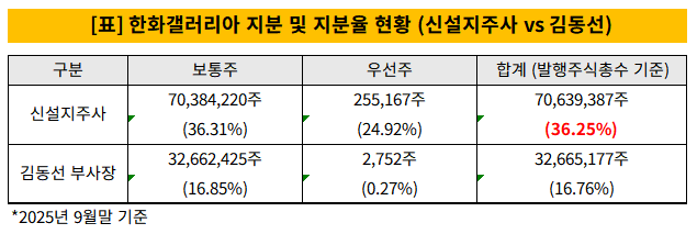 두 가지 짚어볼 포인트가 있습니다. 공정거래법상 지주회사의 상장 자회사 지분 보유 의무는 발행주식총수(우선주 포함) 30%인데, 신설 지주사는 한화갤러리아 발행주식총수의 36.25%를 보유하게 돼 규제 기준을 충족합니다. 추가로 매입해야 할 의무가 없지요.