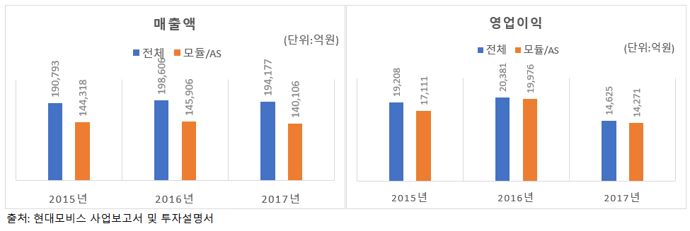2018년의 현대모비스가 딱 그랬습니다. 분할 대상인 모듈/AS부품 사업은 현대모비스의 캐시카우입니다. 2017년 기준으로 현대모비스 전체 매출의 72.1%, 영업이익의 97.5%가 모듈/AS부품 부문에서 나왔죠. 그런데 장부가액 기준 순자산은 현대모비스 전체 21조원 중 모듈/AS부품 사업이 21%인 4조5000억원에 불과했습니다.