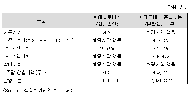 분할도 하기 전에 현대글로비스와 합병비율까지 정하게 되니, 현대모비스의 분할법인에 적용할 주가는 없고, 통상적으로 쓰는 본질가치법을 쓴 겁니다. '상장사 가치는 원래 주가로 해. 비상장사 가치는 원래 본질가치법으로 해' 라는 논리죠.