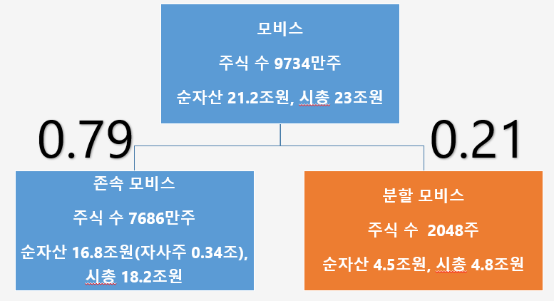 좀 어이없지 않습니까. 주식시장에서 시장가치가 평가되어 시가총액이 존재하는 기업의 주식 수를 나눈다는 것은 시가총액을 나눈다는 의미입니다. 분할법인이 21%의 보통주만 배정받았다는 것은 상장이 유지된다는 것을 전제로 현대모비스 전체 시가총액에서 분할법인이 차지하는 비중이 21%라는 것입니다. 돈은 분할 사업부문에서 거의 다 버는데 말입니다. 당시 현대모비스 보통주 시가총액이 23조원이었으니, 21%면 4조8000억원 정도 됩니다.