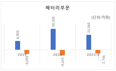 SK이노베이션은 배터리 부문을 분할한 후에도 향후 몇 년간은 지속적으로 막대한 지원을 해야 할 것으로 보입니다. 배터리 부문은 올해 상반기에만 매출 1조원을 돌파해 지난해 퀀텀 점프의 기세를 이어가고 있지만, 아직은 적자 사업입니다. 1분기에 약 1767억원의 영업적자를 기록했고, 2분기에도 약 1000억원의 적자를 보탰습니다.