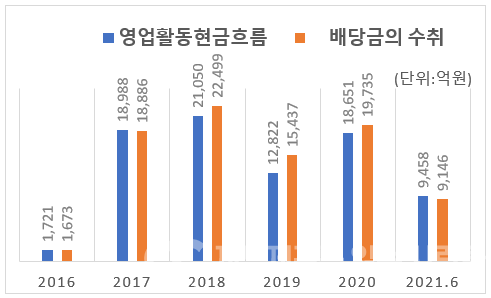 지주회사로서 현금 확보의 가장 큰 수단 중 하나가 자회사로부터의 배당금 수입입니다. 실제로 SK이노베이션은 배터리 부문이 적자 상황이었기 때문에 영업활동 현금흐름의 대부분을 배당금에 의존해 왔습니다. SK루브리컨츠와 SK에너지 등 캐시카우 역할을 하는 계열사에서 오는 배당금이 배터리 부문의 투자 재원이 되어 왔던 것이죠.