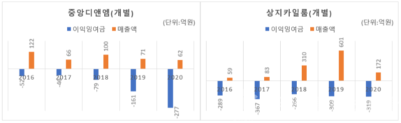비교적 본업 외에 눈을 돌린 게 크게 없지만, 두 회사 모두 실적이 부진을 면치 못했고, 최대주주 교체 직전에는 유동성 부족에 빠져 있었던 것으로 보입니다. 중앙디앤엠은 최근 2년간 매출이 급감하면서 결손이 눈덩이처럼 불었고, 상지카일룸 역시 지난해 매출이 거의 4분의 1토막으로 떨어지고 누적된 결손에서 벗어날 조짐이 없었죠.