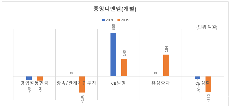 중앙디앤엠은 2018년말 현금성자산(단기금융자산 포함)이 14억원에 불과했는데, 2019년 영업에서 현금을 창출하기는커녕 오히려 34억원 가량이 빠져나가면서 유동성부족에 놓였습니다. 2019년은 중앙디앤엠이 활발하게 자금조달에 나선 시기입니다. 연초부터 서둘러 두 차례 증자에 나서 100억원 가량을 원자재 구입과 인건비 등 운영자금 명목으로 조달했죠. 제이앤에스를 제3자로 하는 70억원 규모의 유상증자를 단행해 최대 주주가 교체되고, 추가로 10억원의 공모 유상증자도 하는데, 조달목적은 모두 운영자금 확보였습니다.