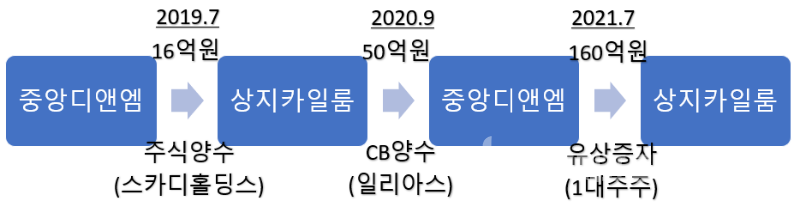 풍부한 현금을 확보한 중앙디앤엠은 가장 먼저 상지카일룸의 유상증자에 참여합니다. 160억원을 투자해 16.91%의 지분율로 최대주주에 오르죠. 상지카일룸에게는 유동성 보강과 재무구조 개선의 상당한 효과가 있었죠.