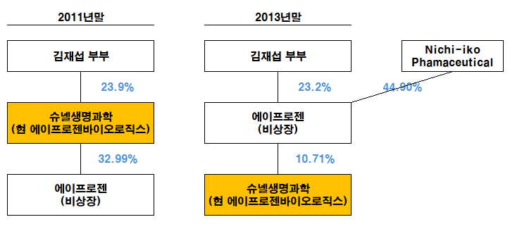 에이프로젠그룹은 2013년까지 김재섭 회장이 인수한 상장사를 통해 신약개발업체인 에이프로젠을 지배하는 구조였습니다. 초기에는 김재섭 회장이 제넥셀세인을 인수하고, 제넥셀세인이 제넥셀과 에이프로젠의 지분을 보유하는 지배구조가 형성됐고, 김재섭 회장이 제넥셀세인을 팔고 슈넬생명과학을 인수한 뒤에는 슈넬생명과학이 에이프로젠을 자회사로 거느렸습니다. 그러나 김재섭 회장이 개인채무 상환을 위해 슈넬생명과학 지분을 처분한 뒤에는 에이프로젠이 슈넬생명과학 지분을 매입하면서 지배구조가 뒤집어집니다. 슈넬생명과학은 에이프로젠의 자회사가 되었고, 에이프로젠의 실질 최대주주는 김재섭 회장이었죠.
