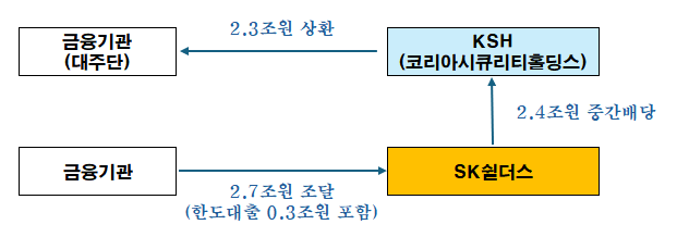 사실 리파이낸싱은 이미 지난 6월말 이전에 완료된 것으로 보입니다. 실질적인 인수주체인 EQT파트너스는 올해 초부터 인수금융 리파이낸싱을 추진해 왔고, 지난 5월 SK쉴더스가 금융권과 차입계약을 체결했죠. 이후 SK쉴더스가 KSH에 대규모 중간배당을 실시했고, KSH가 기존의 인수금융 원리금을 전액 상환했다는 사실이 한국기업평가 등 신용평가사들의 보고서를 통해 확인됩니다. 최근 이루어지고 있는 보도는 넉달이나 늦은 뉴스인 셈입니다.