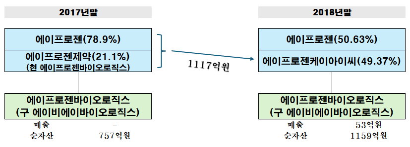 에이프로젠제약과 에이프로젠바이오로직스의 합병은 결국 사실상 우회상장을 한 에이프로젠의 두 자회사끼리의 결합이었고, 그 결과 탄생한 회사가 지금의 에이프로젠바이오로직스인 셈입니다.