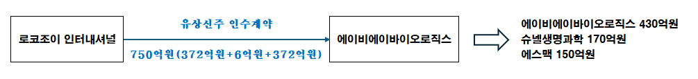 그런데 에이비에이바이오로직스는 의외의 곳에도 큰 자금을 씁니다. 바로 국내에 진출해 크게 사업을 벌여 보려했지만 실패한 게임회사 로코조이인터내셔널을 인수한 것이죠. 2017년 1월 에이비에이바이오로직스가 430억원, 슈넬생명과학이 170억원 등 600억원의 거금을 들여 제3자 유상증자에 참여해 31.6%의 지분을 취득합니다.