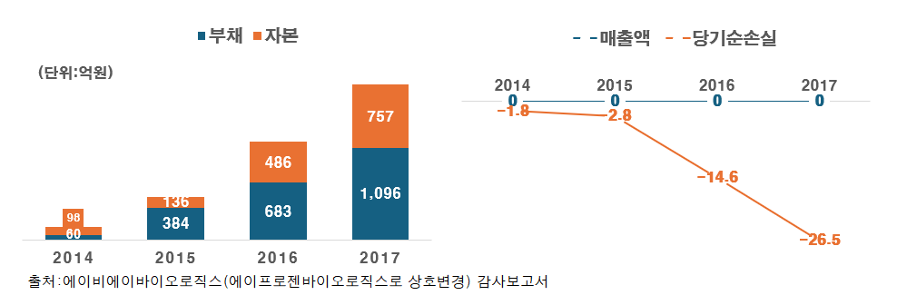 에이비에이바이오로직스의 경우 2017년까지 4년간 설립자본금과 유상증자로 320억원, 신주인수권부사채로 1000억원, 전환사채 발행으로 330억원, 단·장기 차입으로 277억원 등 1900억원 가까운 자금이 투입되었습니다. 모회사인 에이프로젠과 에이프로젠의 자회사인 슈넬생명과학이 자금의 주요 출처였습니다.