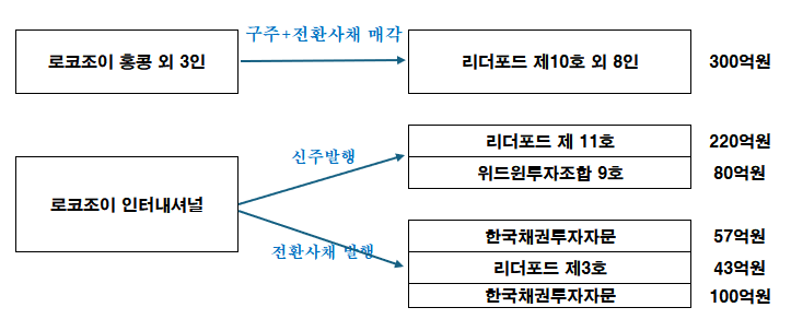 원영식씨는 리더포드라는 이름의 일련의 투자조합을 앞세웠습니다. 리더포드 제10호 외 8인의 양수인들은 로코조이홍콩으로부터 보통주와 전환사채를 총 301억원에 매입하기로 하고, 로코조이가 제3자배정 유상증자로 발행하는 신주도 리더포드 제11호 등 투자조합들이 300억원에 인수하기로 합니다. 로코조이는 이 밖에도 200억원의 전환사채를 발행해 한국채권투자자문, 리더포드 제3호 투자조합, 제이엘1호조합에 넘기죠.