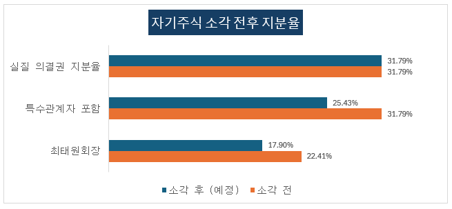 SK의 자기주식 소각은 최태원 회장의 소유 지분율을 높여줍니다. 하지만 상법상 자기주식은 의결권이 없기 때문에 ‘지배력’을 의미하는 의결권 지분율에는 전혀 영향을 주지 않습니다. 최태원회장과 특수관계자들의 소유 지분율(5% rule에 의한 공시 지분율)은 25.43%에서 31.79%로 상승하겠지만, 실질 지배력에 해당하는 의결권 지분율은 이미 31.79%이고 자기주식 소각에 전혀 영향을 받지 않습니다.