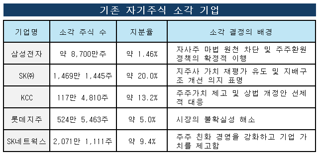 기존 자기주식 보유기업들은 자기주식을 취득할 때 주주환원을 강조했을 것입니다. 주가에도 긍정적인 효과를 주었겠지요. 그 자기주식 소각은 취득에 다른 주주환원의 효과를 확정짓는 것이라고 생각하시면 됩니다.