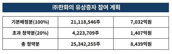 실권이 발생하지 않는다면, ㈜한화가 납입해야 할 대금은 7,032억원이 됩니다. 물론 신주 발행가액이 바뀌면 이 숫자도 바뀝니다. 실권이 발생하면 ㈜한화는 최대 422만여주를 더 인수할 수 있고, 최대 납입대금은 8,439억원으로 늘어나게 되죠. ㈜한화가 공시에서 밝힌 출자금액은 이렇게 나온 값입니다.