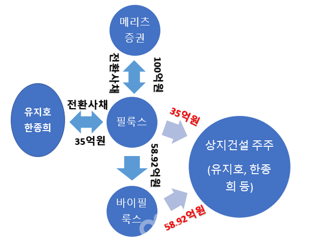 블루커넬을 최대 주주로 삼은 필룩스가 처음 인수한 회사는 상지건설인데, 이 거래가 나름 흥미롭습니다. 후에 상지카일룸과도 연결되죠. 필룩스는 2016년 7월 자회사인 ㈜바이필룩스와 함께 상지건설 지분 75.88%를 사들입니다. 필룩스가 31.58%를 35억원에, 바이필룩스가 44.3%를 58억9200만원에 취득합니다. 상지건설은 약 30억원의 유상증자...