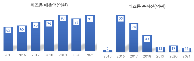 위즈돔을 투자처로 한 디에이테크놀로지와 오아시스홀딩스의 연대는 처참한 실패로 끝납니다. 오아시스홀딩스가 디에이테크놀로지에 지분을 매각한 2018년부터 위즈돔이 급격한 내리막길로 치닫습니다. 사실 매출이 급격한 변동은 없었습니다. 코로나 영향인지 2020년에 주춤했지만 이듬해 곧바로 반등해 오히려 증가세를 유지하고 있었습니다. 통근버스 운영사업에 큰 문...