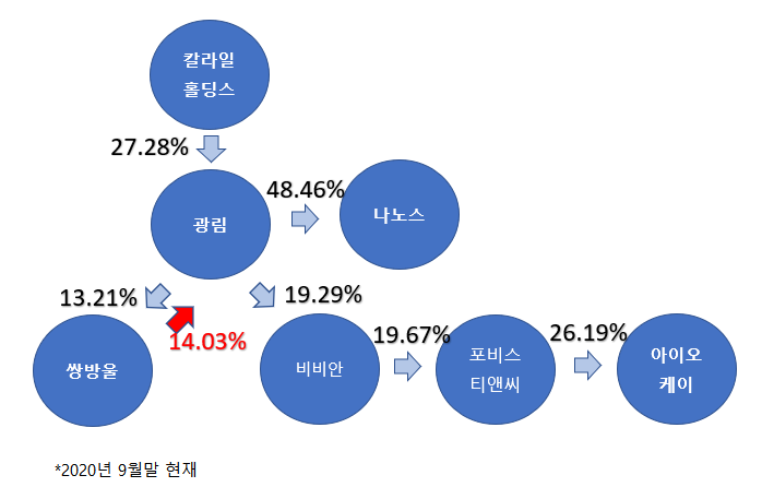 광림을 축으로 쌍방울 비비안 포비스티앤씨로 이어지는 기업집단을 쌍방울그룹이라고 부르던데, 아마 쌍방울이 기업집단의 시작점이기 때문일 것입니다. 지금은 광림이 최상위 지배기업이니 여기에서는 편의상 광림그룹이라고 부르겠습니다. 이 그룹 안에는 나노스, 미래산업 등이 있고, 가장 최근에 연예기획사 아이오케이컴퍼니(이하 아이오케이)가 합류했죠. 지난해 연쇄적...