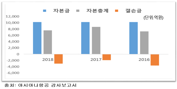 아시아나항공은 결손기업입니다. 2018년말 현재 결손금이 약 3000억원 정도 됩니다. 자본총계가 자본금 아래로 떨어져 부분 자본잠식 상태입니다. 장사가 잘 되지 않아서든, 장사는 잘 되는데 옆으로 새는 돈이 많아서 그렇든, 그 이유가 무엇이든 간에 그 동안 경영이 부실했습니다. 2014년에 자율협약에서 벗어나기는 했지만, 여전히 정상을 회복하지 못한...